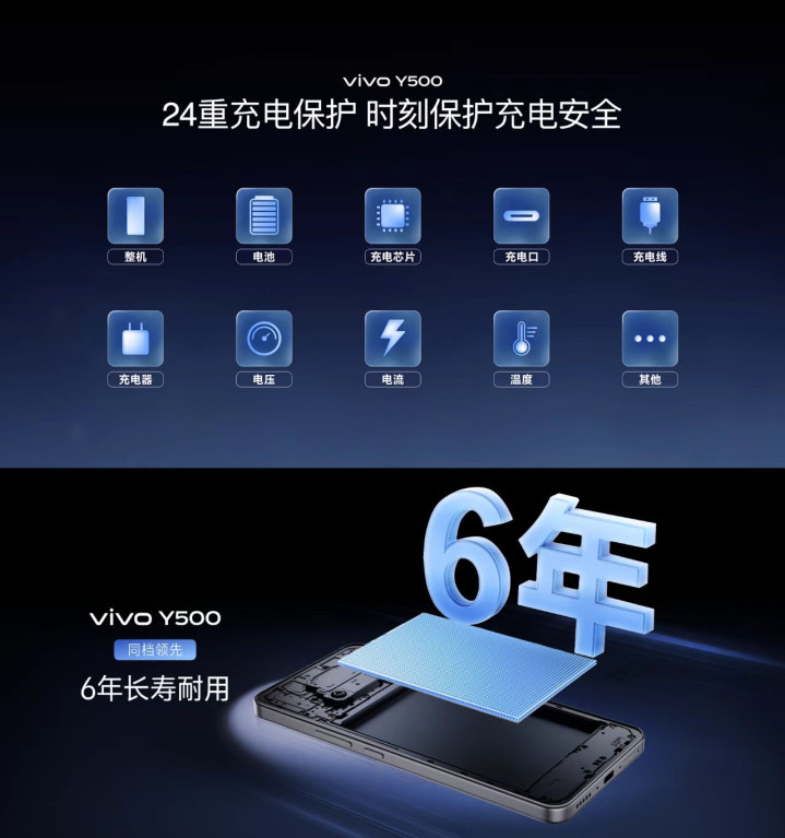 总的来说,vivo Y500的续航表现十分持久耐用,略有惊喜。如果你需要一款续航可靠、价格亲民的机型,Y500会是一个稳妥的选择。同时,多重充电保护和直驱供电等功能,vivo Y500为你带来6年之久的耐用新体验。